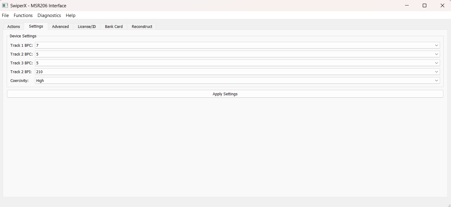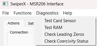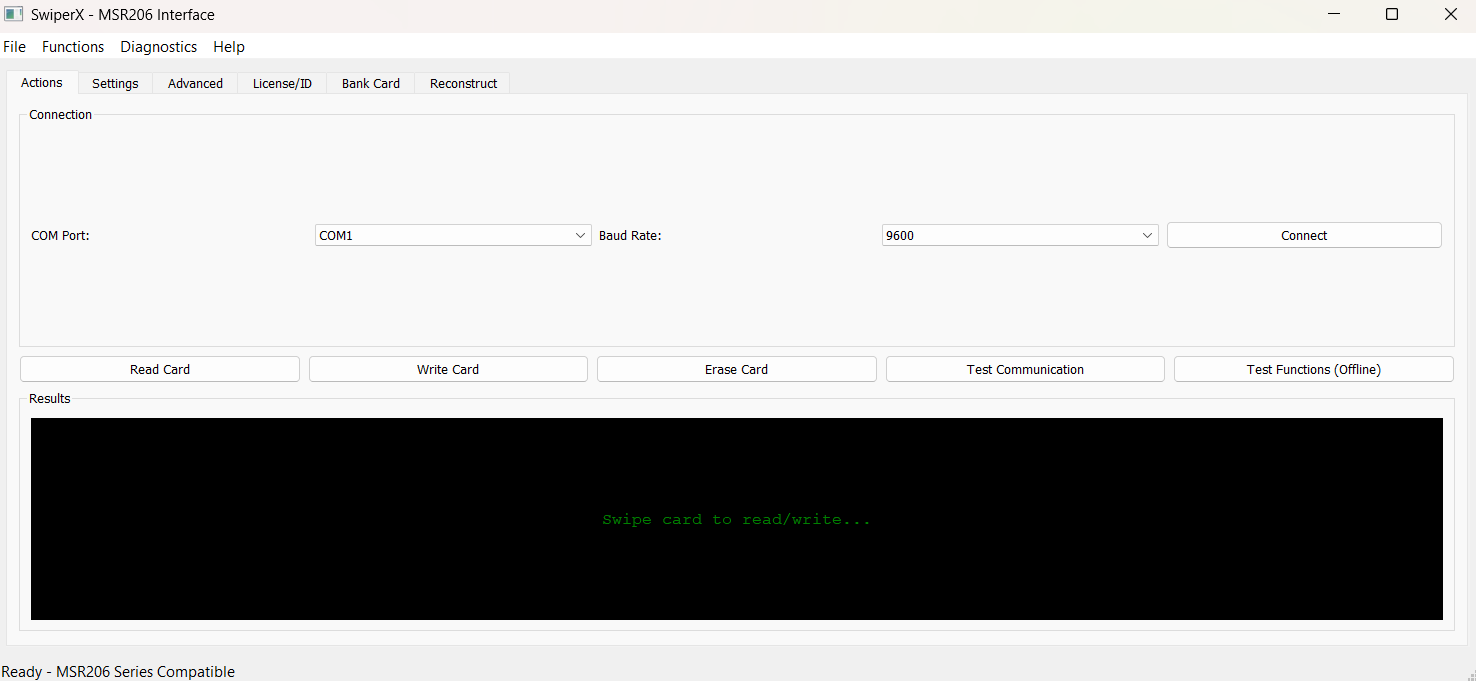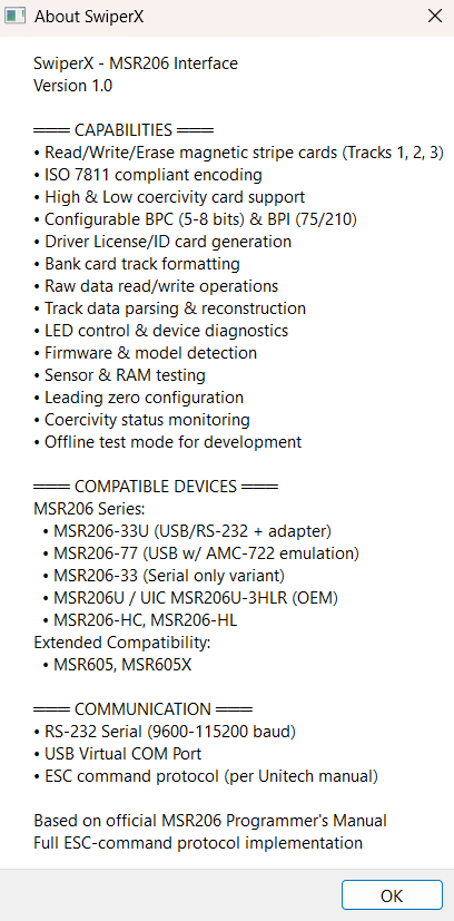 SwiperX provides a comprehensive GUI for MSR206 hardware control with professional diagnostics and ISO-compliant tools.