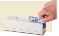 Demonstration of proper card swiping technique through MSR206 slot for successful read/write operations.