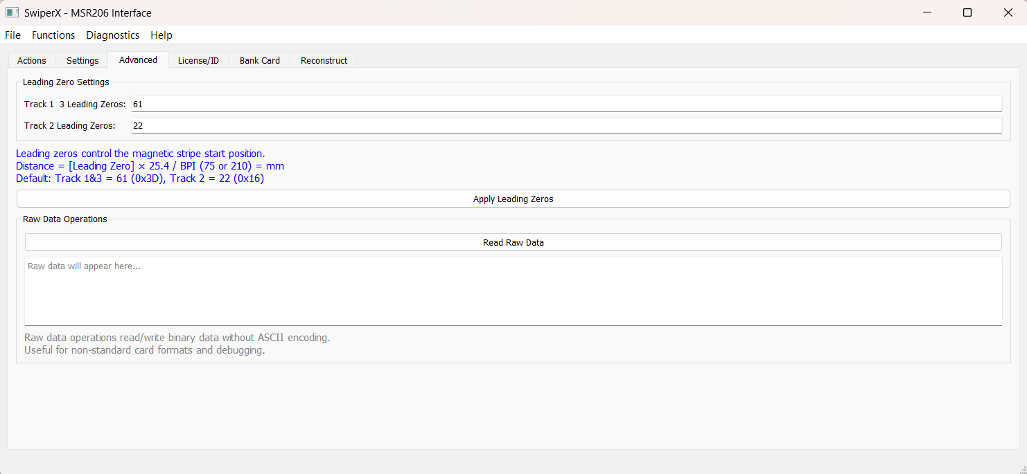 Leading zero configuration (tracks 1/3: 61 dec, track 2: 22 dec), raw binary data operations, and hex data display for debugging.
