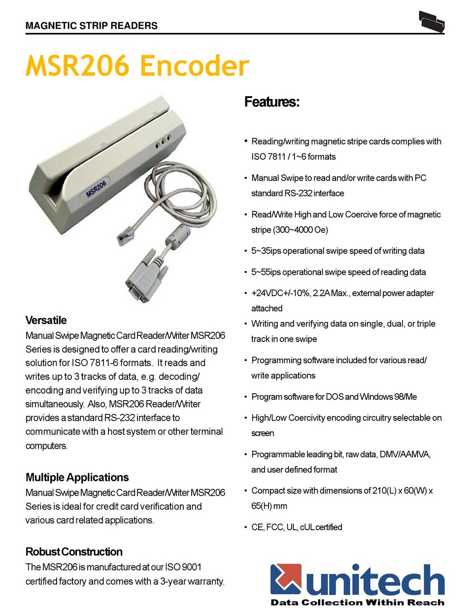Technical specs: track configuration, encoding standards, read/write heads, supported card types, and interfaces.